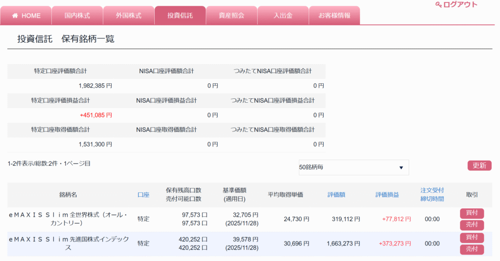 大和コネクト証券の口座では現金からは拠出せず、dポイントの消化専用とし、あくまでリスク資産のメイン口座はSBI証券1つにまとめる方針としています。