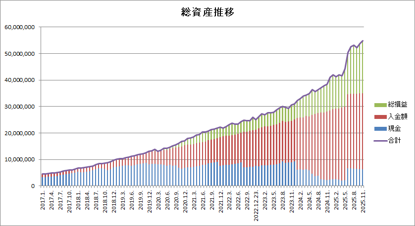 11月の総資産は個別株式、投資信託ともに上昇したことで過去最高額の5,481万円となりました。