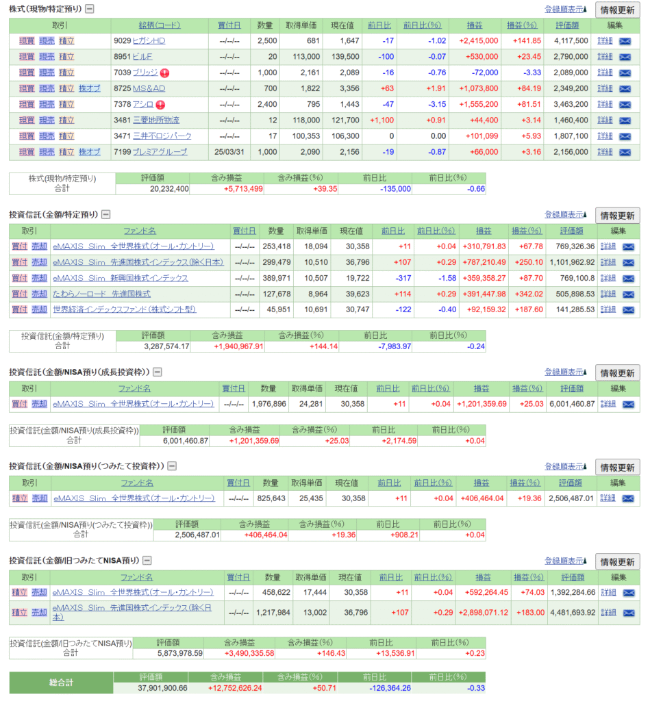 リスク資産の損益は、前月比で、個別株式が-202万円、投資信託が+75万円の合計-127万円でした。