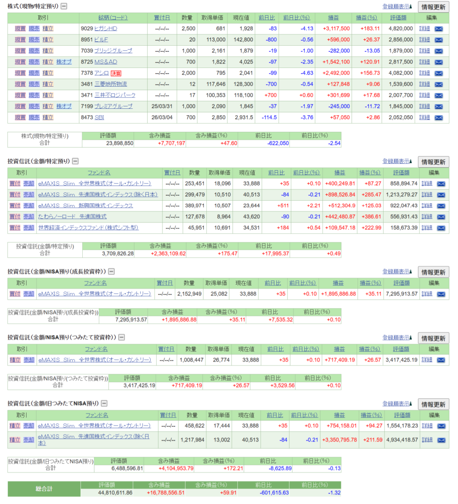 本日は株価が大きく動いたため、メイン証券であるSBI証券のみの資産状況を簡易的にご報告します。