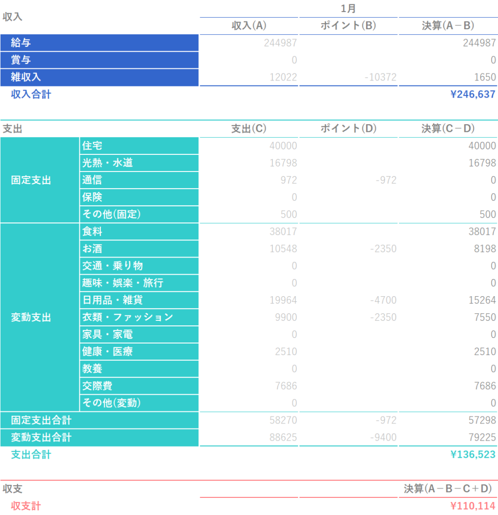 1月は期間限定楽天ポイントを10,000ポイント以上使用したため、その分支出を抑えられています。