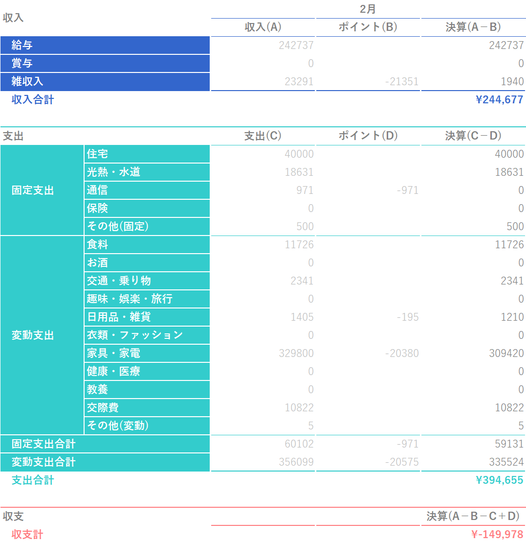 ポイントは収入合計には含めておらず、値引き扱いとしています。ただし、現金化した分については、収入扱いとしています。