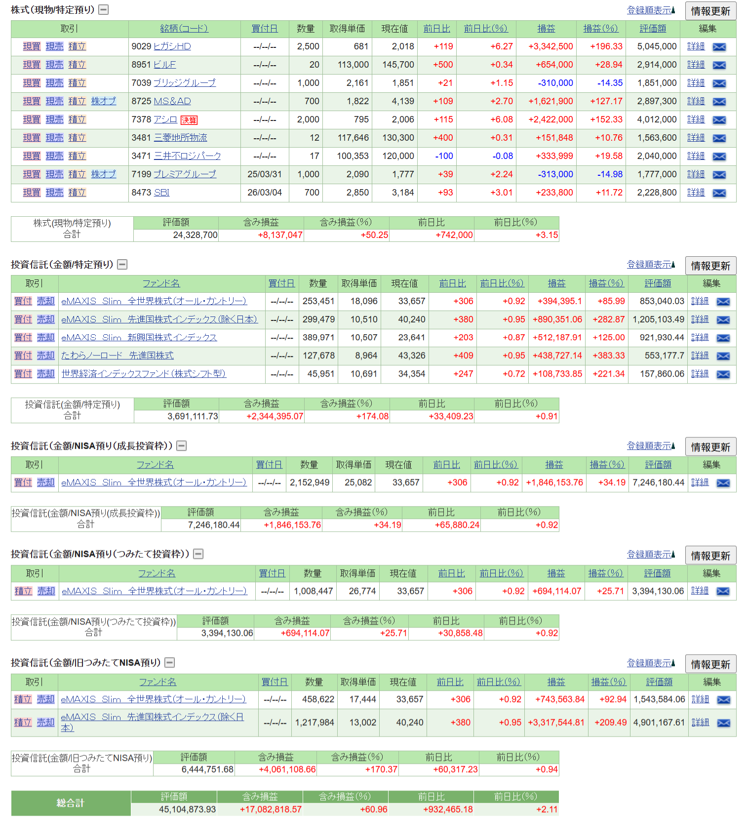 含み損益は、前日比で個別株式+742,000円、総合計+932,465円になりました。